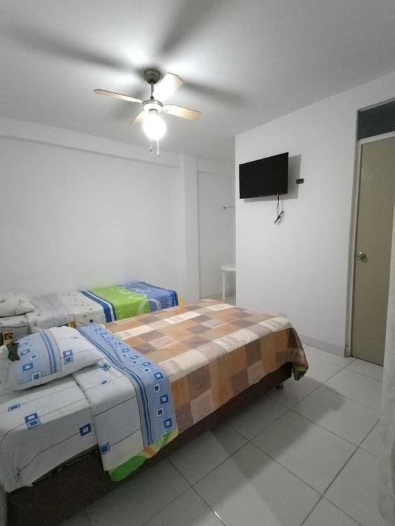 Habitación doble con baño privado y TV por cable.