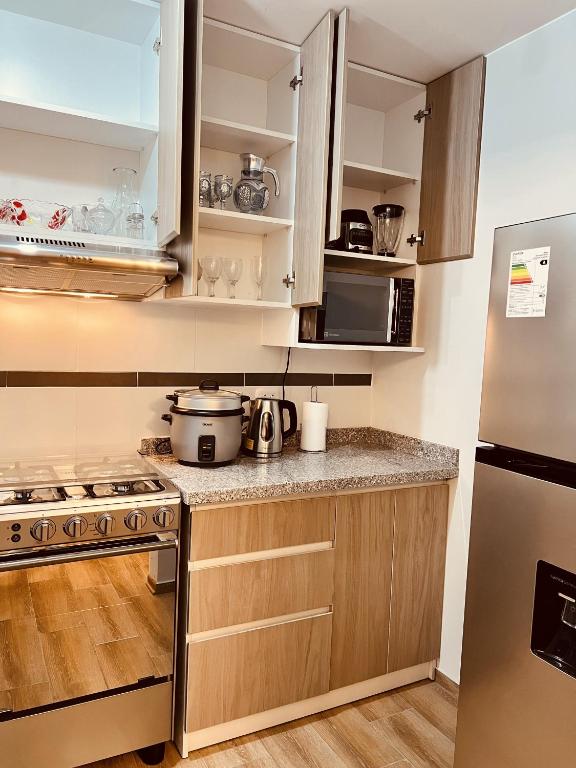 Zona de cocina, Nevera, Microondas, Lavavajillas, Lavadora, Cocina, Hervidor eléctrico, Utensilios de cocina, Tostadora, Cafetera, Mesa de comedor, Copas de vino